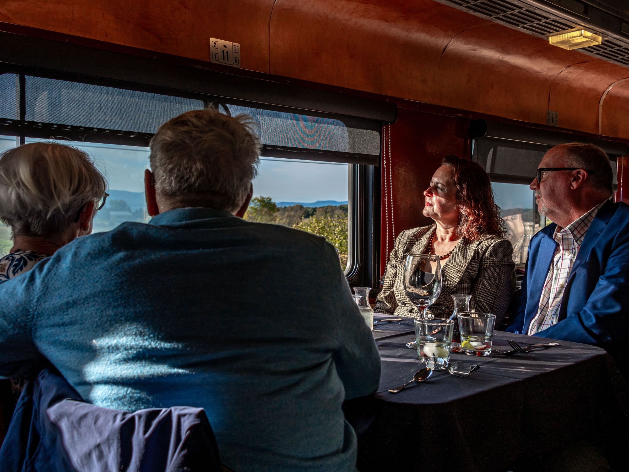 The Maple Suite – Featuring a private suite with elegant decor, seating on both sides of the car so you never miss out on the lake or country views, hors d’oeuvres, and full dinner service. Perfect for a date night or special celebrations. Seating up to four guests for $160 per person.