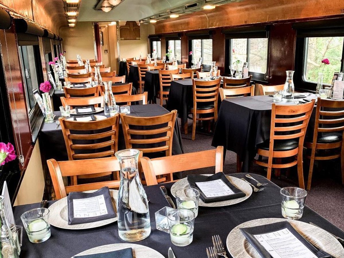 Romance On the Rails – Enhance your dining experience with a bottle of champagne, rose petals on your table, chocolate-covered strawberries to enjoy with your champagne, a special cheesecake for dessert, and souvenir champagne flutes. This package is available as an add on for a Private Table for Two for an additional $150.
