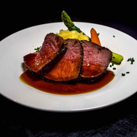 Pink Peppercorn, Rosemary, and Fennel Seed Crust, Cider Gastrique, and Mashed Potatoes