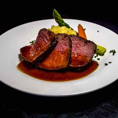 Fork Tender Short Rib, Hunter’s Sauce of Mushroom, Tomato & Pearl Onions, Whipped Yukon Golds, Peas & Carrots